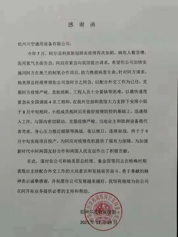 2021年11月29日,中國駐阿爾及利亞大使館給我公司杭州川空發(fā)來感謝信,對杭州川空在新冠疫情十分嚴(yán)峻的情況下,克服困難支持阿方推動液體空分的投產(chǎn),助力挽救病患生命所作出的努力表示感謝,對杭州川空楊美原總經(jīng)理以及童金國等同志在特殊時期支持和配合外交工作的大局意識和發(fā)揚(yáng)艱苦奮斗、勇于奉獻(xiàn)的精神表示感謝。