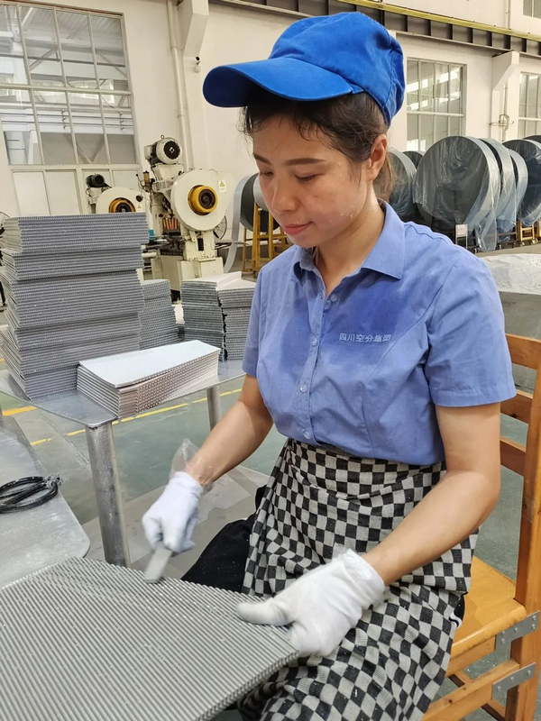 冷箱廠在完成應(yīng)城50000空分上塔裝配填料的過(guò)程中,員工們不怕酷熱,揮汗如雨,8月12日,上塔最后一段塔器完工發(fā)運(yùn)。8月15日,經(jīng)過(guò)員工們的辛勤工作,容器廠完成了邯鄲精制F314.60000的撬裝裝配任務(wù)。當(dāng)天晚上9點(diǎn)鐘,容器二車間燈火通明,該項(xiàng)目所有設(shè)備發(fā)運(yùn)出廠。8月16日,貴州中偉8000空分上塔、液氧蒸發(fā)器、下塔與主冷復(fù)合,全部完工等待發(fā)運(yùn)。8月19日前,換熱器廠完成了恒重、延長(zhǎng)項(xiàng)目等多個(gè)的主換熱器制造任務(wù)。