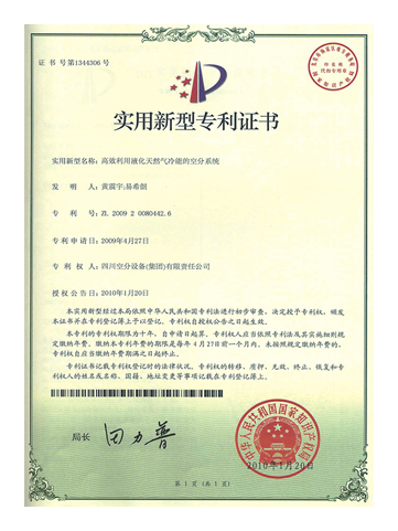 實(shí)用新型專利證書-從空氣中制取低純度氧氣的深冷法分離裝置