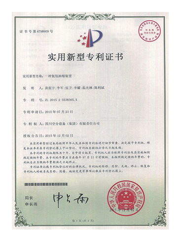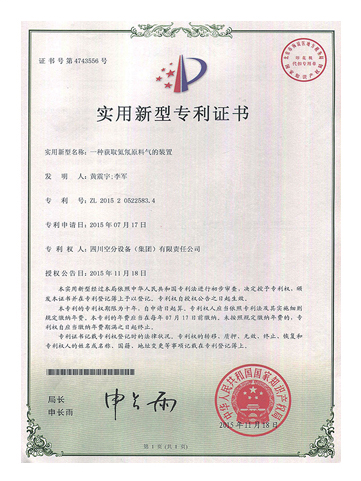 實(shí)用新型專利證書-帶制冷循環(huán)的低能耗制氮裝置