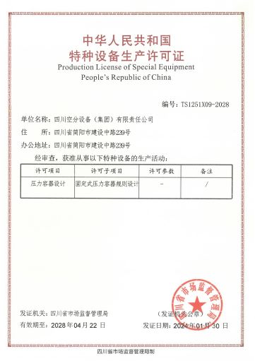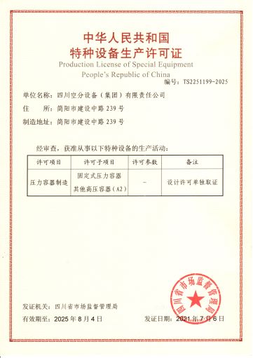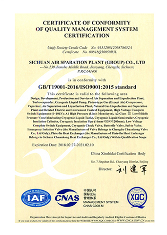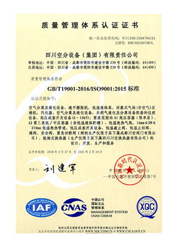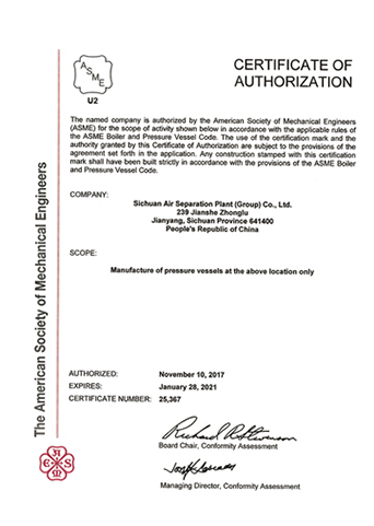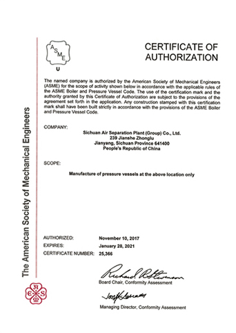 公司在推行全面質(zhì)量管理的基礎(chǔ)上,通過各種專業(yè)認(rèn)證,進一步提高了公司質(zhì)量管理水平和質(zhì)量保證能力。公司早在1987年就取得三類(A級)壓力容器設(shè)計、制造資格,順利通過了國家主管部門組織的歷次換證評審,目前公司已具有A1、A2、C2級壓力容器設(shè)計資格,GC1級壓力管道設(shè)計資格,A2、B3、C2級壓力容器制造資格。全面覆蓋公司所設(shè)計、制造的壓力容器、壓力管道及元件種類。公司于1990年取得美國機械工程師協(xié)會頒發(fā)的ASME授權(quán)證書及U、U2鋼印,并順利通過歷次換證檢查;公司于1996年取得中國機械工業(yè)認(rèn)證中心頒發(fā)的GB/T19001質(zhì)量管理體系認(rèn)證證書并順利通過歷次換證審核;2003年,公司的低溫液體運輸車、半掛車首批取得國家3C強制認(rèn)證。公司出口的成套空分設(shè)備和天然氣液化設(shè)備通過了歐盟CE認(rèn)證。